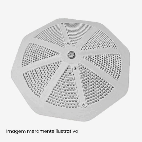 Tampa da grelha anti-prisionamento para instalação no ralo de fundo. Indicada para uso em piscinas em concreto, de fibra de vidro e de vinil. Destaca-se o projeto de lei – PL – 7414/2010 onde se propõe a utilização obrigatória de tampas de dreno que previnam o turbilhamento e o enlace de cabelos.
