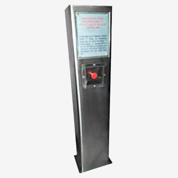 TOTEM – fabricado em aço inox com botoeira de trava e adesivo sinalizador com proteção em acrílico.